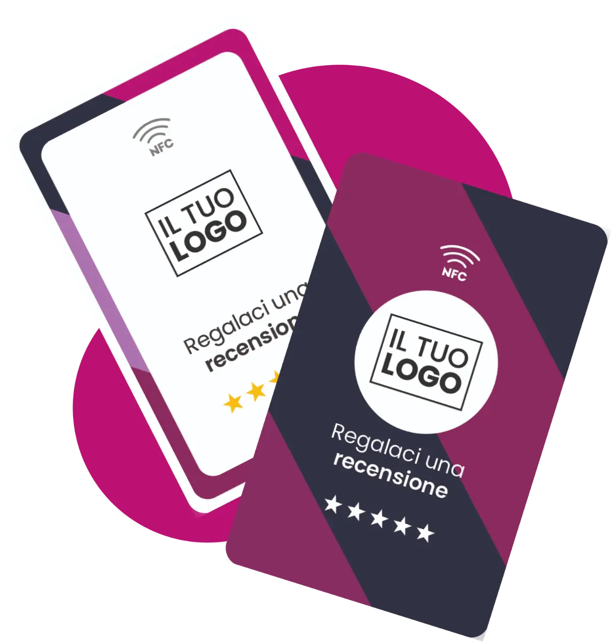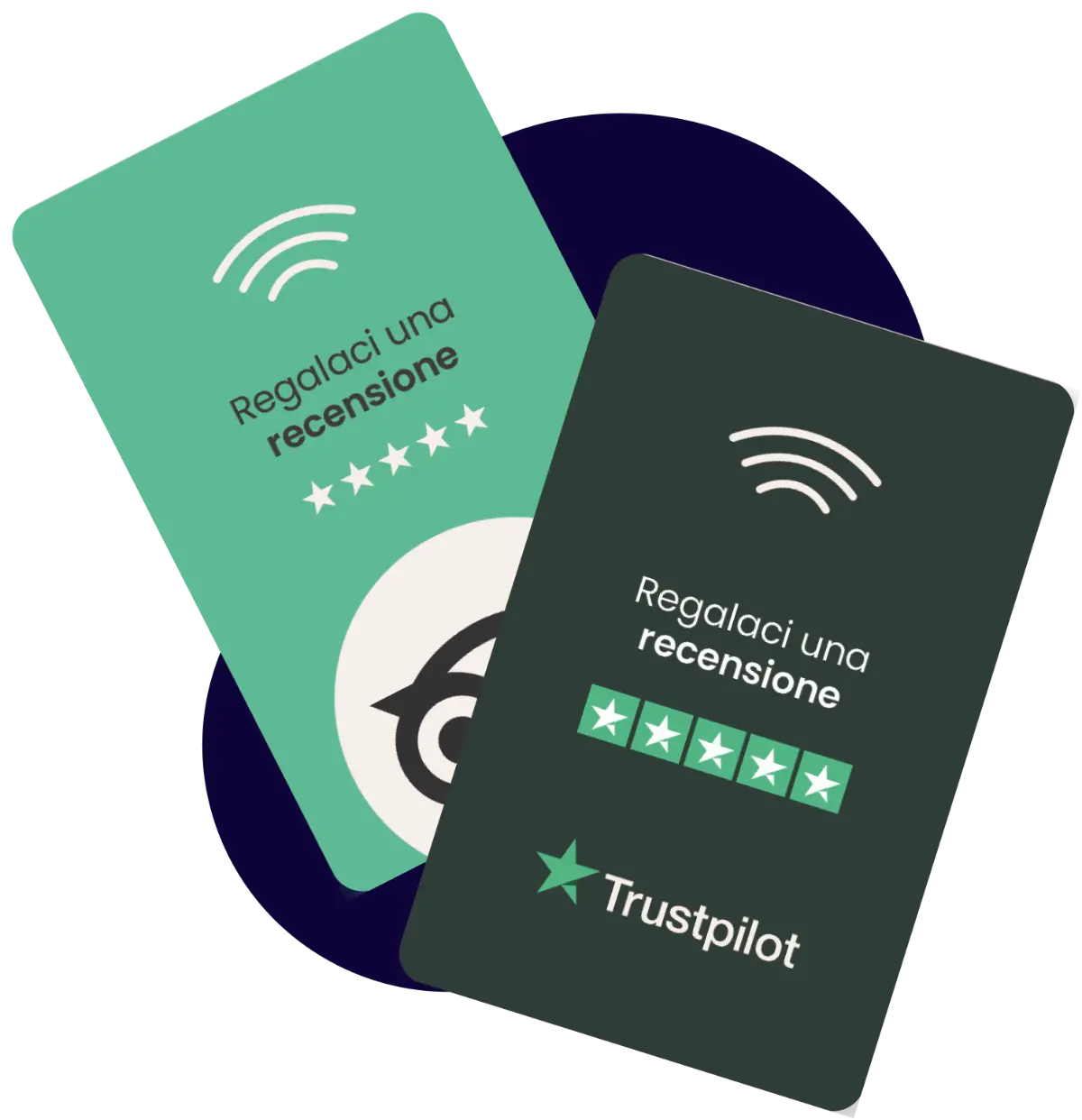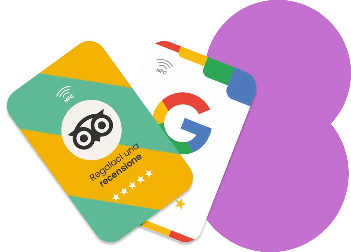 Le card recensioni con NFC contengono un chip che può essere letto da dispositivi compatibili con la tecnologia NFC (Near Field Communication). Basta avvicinare il dispositivo alla card per accedere alla pagina recensioni.